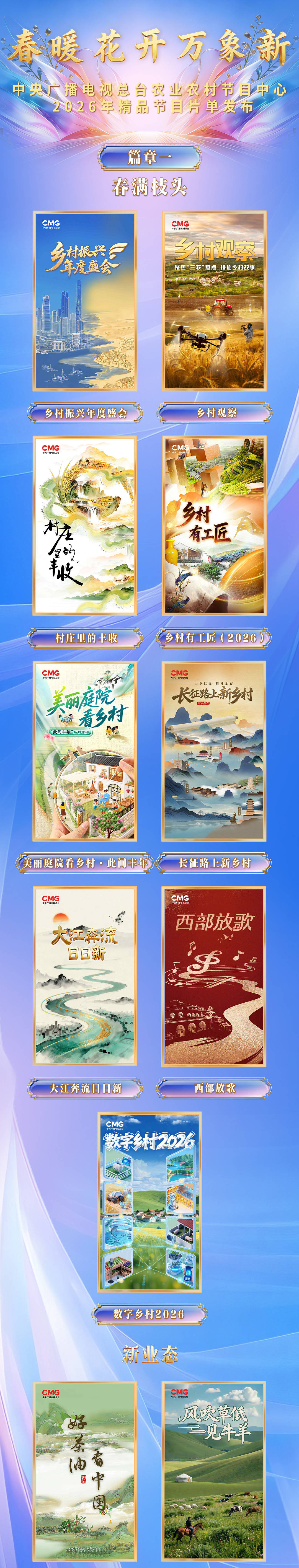 “春满枝头”篇章集中发布了29部精品力作,描绘中国新农村壮丽画卷。《乡村振兴年度盛会》锚定农业农村现代化,展示乡村全面发展的新实践、新经验。纪录片《村庄里的丰收》记录神州大地上丰富多彩的丰收庆典,探寻村庄里绵延不绝的中华文明。融合传播项目《乡村观察》通过纪实影像与实地探访,呈现“三农”领域最新发展成果;《乡村有工匠(2026)》继续讲好“一技富千家”的乡村故事;《美丽庭院看乡村·此间丰年》以女性带头人的视角,探索共同富裕的微观实践。特别策划《长征路上新乡村》讲述新时代“长征路”上农业强、农村美、农民富的奋斗故事。系列报道《大江奔流日日新》关注推动长江经济带发展座谈会召开十年来,沿江两岸农业农村现代化进程中的发展新动能、新模式。大型融合传播项目《西部放歌》唱出西部村庄的新景象。融媒体项目《数字乡村2026》关注“数字浪潮”如何成为乡村发展新动力。《好茶油 看中国》《风吹草低见牛羊》《茶香中国》《沃土同芳》《漂洋过海来看你》《神农“唱”百草》聚焦产业一线,通过“线上+线下”融合传播,展现乡村发展新面貌。《当AI遇见乡村》《一技星火》《群英汇·有话直说》《最炫的OFFER》《最美回乡路》《共富之约》反映新质生产力赋能乡村振兴、加快推进农业农村现代化的生动实践。《物候记·四时之飨》《光影田园》《耕读中国》《山海越千年·成语话振兴》《乡村营造+》《健康中国乡村行》《时光的礼物——2026银龄之约新春晚会》多角度描绘乡村新貌,勾勒乡村发展新风尚。农历丙午马年将至,融合传播项目《马上出发》以马产业为切口,呈现农文旅融合的新成效。