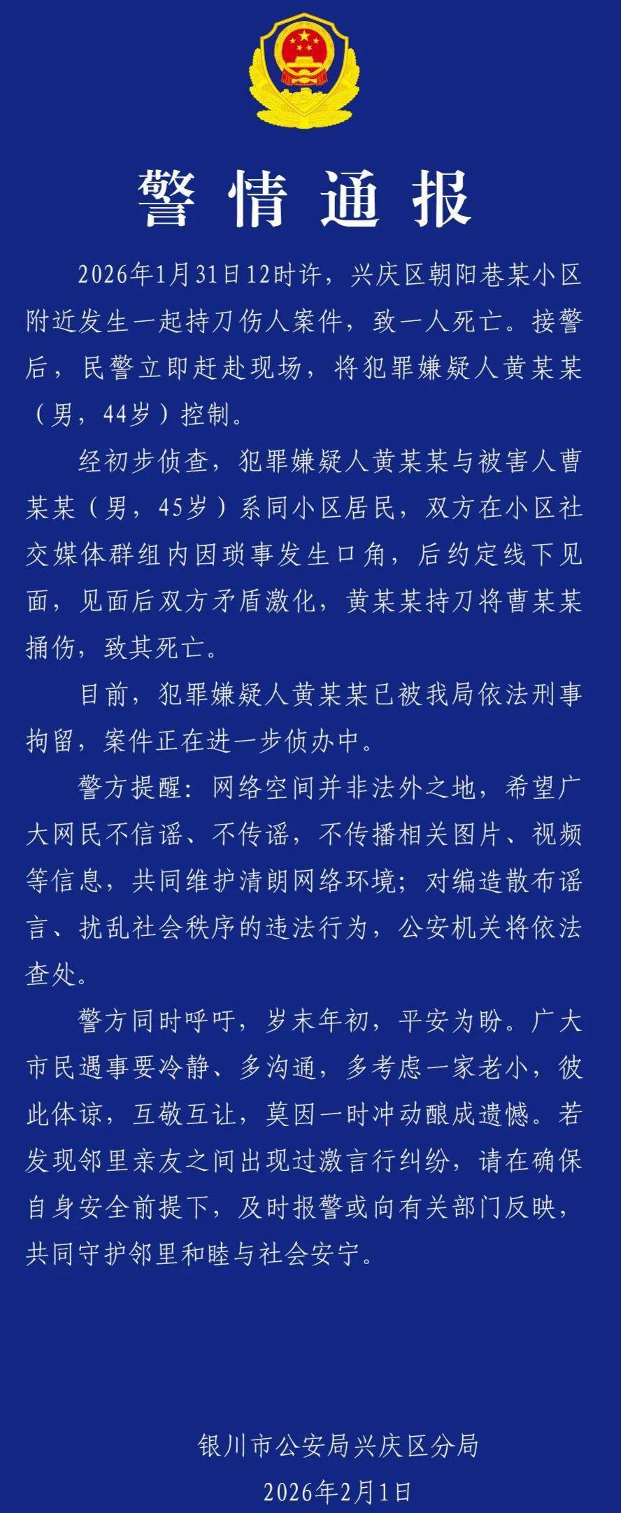 2月1日上午,银川市兴庆区公安通报,1月31日12时许,兴庆区朝阳巷某小区附近发生一起持刀伤人案件,致一人死亡。接警后,民警立即赶赴现场,将犯罪嫌疑人黄某某(男,44岁)控制。