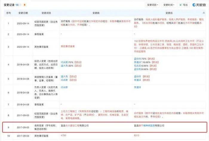 值得注意的是,宜昌康宁精神病医院有限公司前身为宜昌永大建设工程有限公司。该公司成立时名为宜昌永大土石方工程有限公司,2010年变更名称为宜昌永大建设工程有限公司。2017年,该公司再次变更名称与经营范围,成为宜昌康宁精神病医院有限公司。
