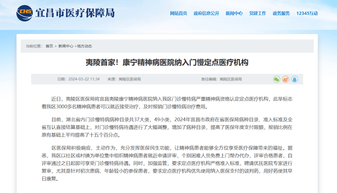 据夷陵区医保局消息,2024年,宜昌康宁精神病医院被纳入门慢定点医疗机构,成为该区首家门诊慢特病严重精神病资格认定定点医疗机构。