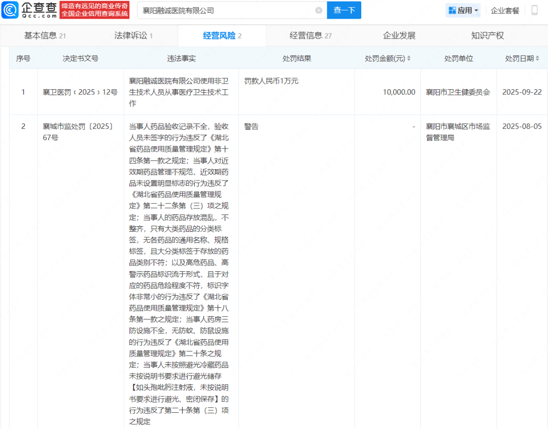 去年9月,该医院因使用非卫生技术人员从事医疗卫生技术工作被襄阳市卫生健委员会罚款1万元。