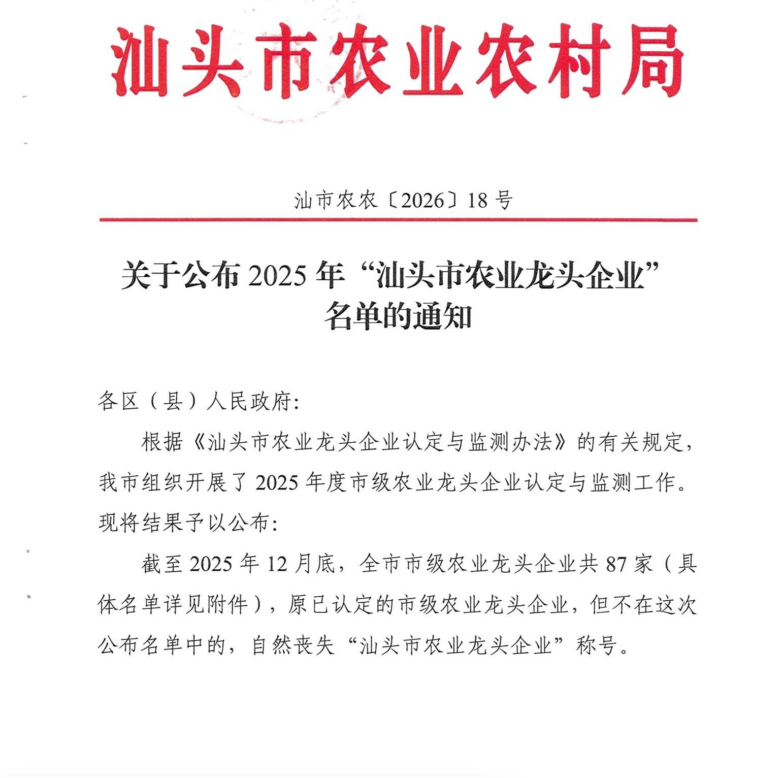 近日,汕头市农业农村局官网发布了《关于公布2025年“汕头市农业龙头企业”名单的通知》。该通知显示,截至2025年12月底,全市市级农业龙头企业共87家,原已认定的市级农业龙头企业,但不在这次公布名单中的,自然丧失“汕头市农业龙头企业”称号。