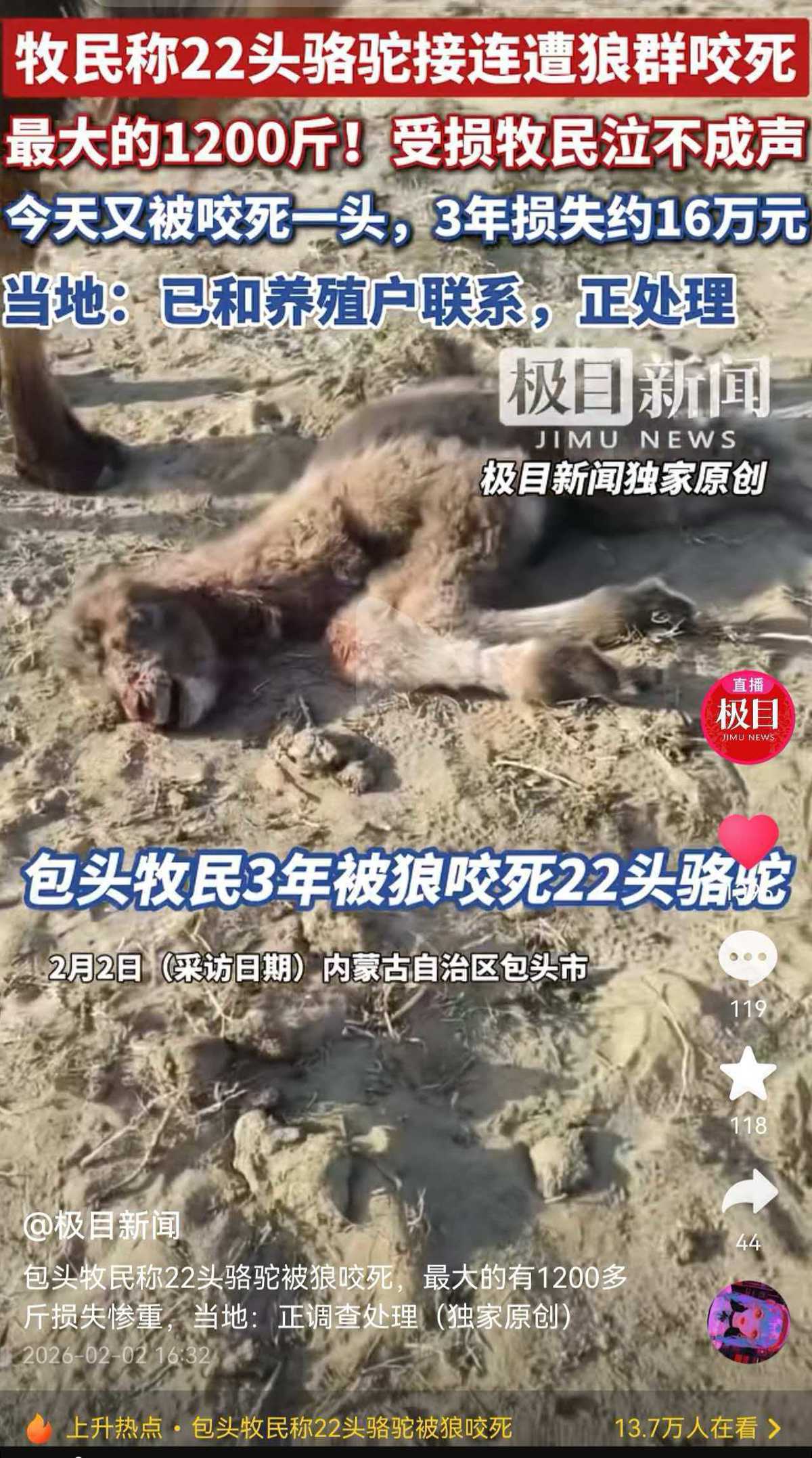 2月2日,内蒙古包头市牧民石女士向极目新闻记者反映,最近三年来家里已有22头骆驼被狼咬死,总损失约16万元,多次向相关部门反映,未得到解决。极目新闻报道此事后,当地多部门上门处理,落实补偿帮扶事宜,推进草场围封防护,强化相关政策宣传。