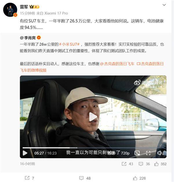 博主 “杰克森的落日飞车” 发布的这条视频,目前在微博平台已收获75万次观看,话题 #26万公里的小米SU7车况公开 #也引发了热烈讨论,雷军也亲自进行了转发。