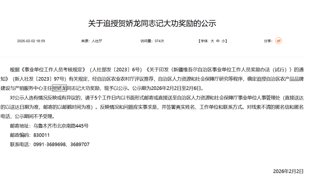 2月2日,新疆维吾尔自治区人社厅发布《关于追授贺娇龙同志记大功奖励的公示》。