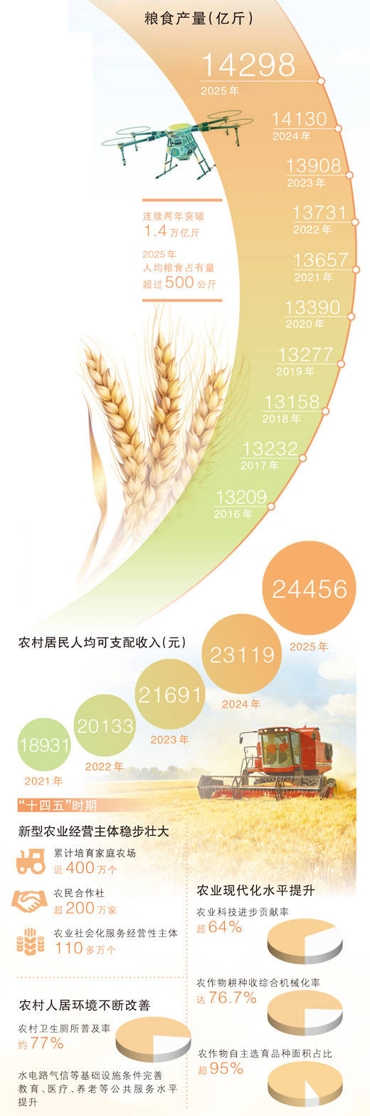 2025年,我国粮食生产克服多重不利天气影响,产量再创历史新高,连续两年稳定在1.4万亿斤以上。