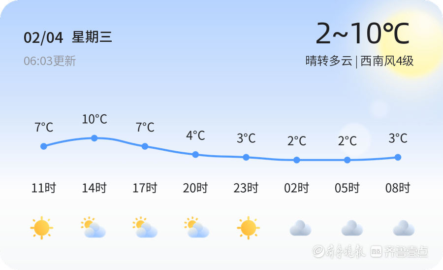 今天是2月4日,星期三,农历十二月十七。立春已至,然而烟台的天气却迎来了新一轮的降温。今日天气晴转多云,气温在2℃至10℃之间,西南风4级,空气湿度为71%,PM2.5指数为132。立春是二十四节气之首,标志着春季的开始,然而烟台的气温并未随之回暖。各区天气情况基本一致,均为多云转阴,气温变化不大,市民需注意保暖。明天天气较今日有所变化,气温将大幅下降,最低气温降至-7℃,最高气温仅为4℃,北风4-5级,天气为多云转阴。与今日相比,明日的降温幅度较大,市民需提前做好防寒准备。未来三天,烟台天气将以阴冷为主,气温持续低位运行,最低气温可达-7℃,最高气温在10℃左右。预计周五至周日,天气以阴、小雪转晴为主,气温逐步回升。特殊天气情况下,市民需注意防滑保暖,出行时务必关注天气变化,确保安全。温馨提示