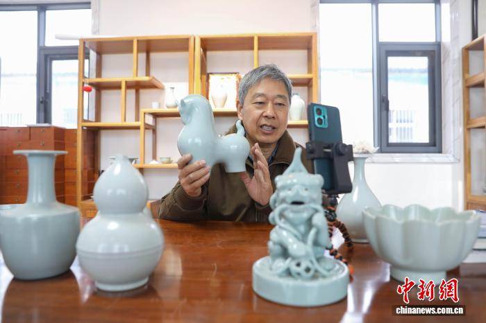 2月3日,河南平顶山宝丰县,汝瓷手工艺人创作烧制生肖马系列产品,以供应春节市场需求。图为国家级非物质文化遗产汝瓷烧制技艺代表性省级传承人王国奇在直播推介生肖马作品。 何五昌 摄