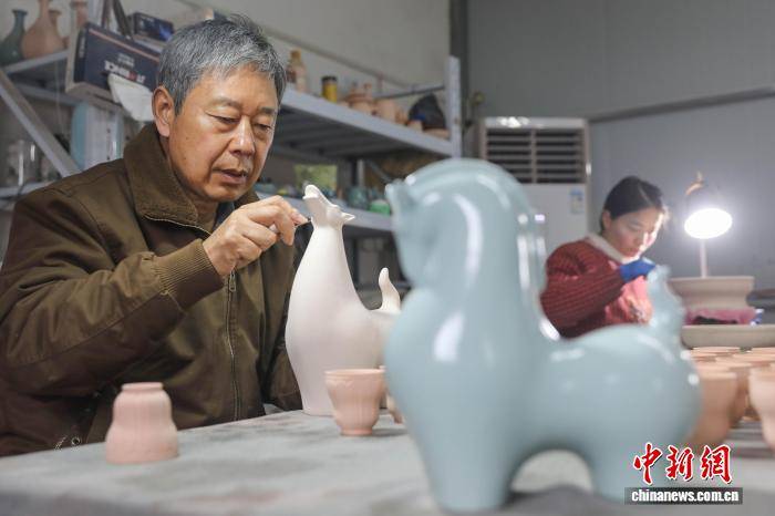 2月3日,河南平顶山宝丰县,汝瓷手工艺人创作烧制生肖马系列产品,以供应春节市场需求。图为国家级非物质文化遗产汝瓷烧制技艺代表性省级传承人王国奇(左)在修饰素坯。何五昌 摄