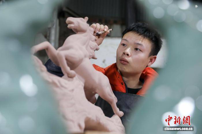 2月3日,河南平顶山宝丰县,汝瓷手工艺人创作烧制生肖马系列产品,以供应春节市场需求。图为大营镇汝瓷手工艺人刘朝飞在修釉。 何五昌 摄