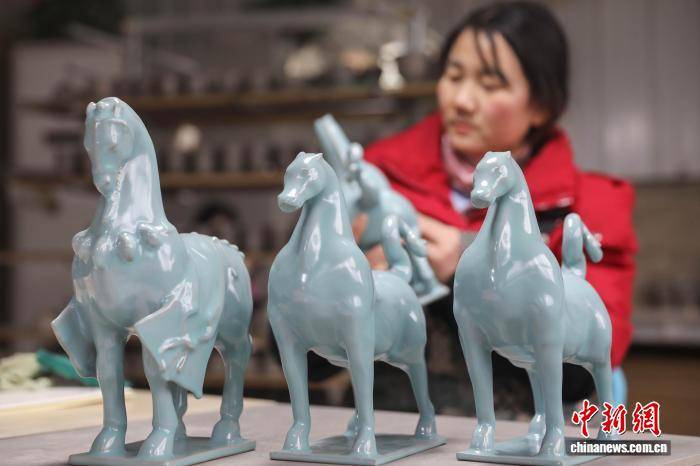 2月3日,河南平顶山宝丰县,汝瓷手工艺人创作烧制生肖马系列产品,以供应春节市场需求。图为张八桥镇汝瓷企业工作人员在检查生肖马成品质量。 何五昌 摄