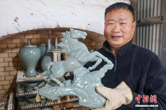 2月3日,河南平顶山宝丰县,汝瓷手工艺人创作烧制生肖马系列产品,以供应春节市场需求。图为大营镇汝瓷手工艺人刘国和展示其制作的生肖马作品。 何五昌 摄