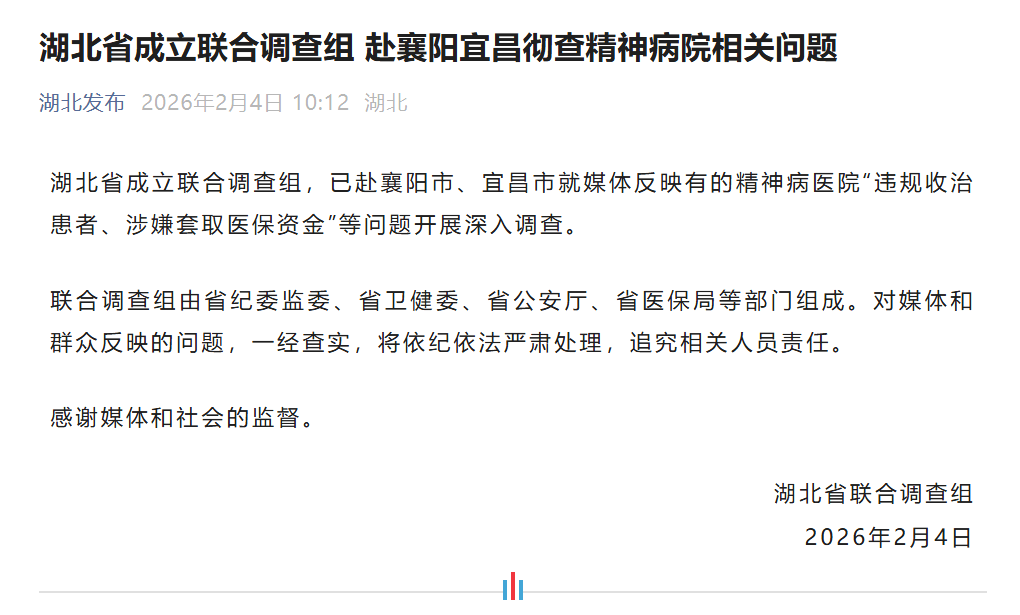 2月4日,据湖北发布消息,湖北省成立联合调查组,已赴襄阳市、宜昌市就媒体反映有的精神病医院“违规收治患者、涉嫌套取医保资金”等问题开展深入调查。