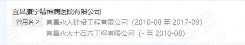 值得注意的是,宜昌康宁精神病医院有限公司前身为宜昌永大建设工程有限公司。该公司成立时名为宜昌永大土石方工程有限公司,2010年变更名称为宜昌永大建设工程有限公司。2017年,该公司再次变更名称与经营范围,成为宜昌康宁精神病医院有限公司。