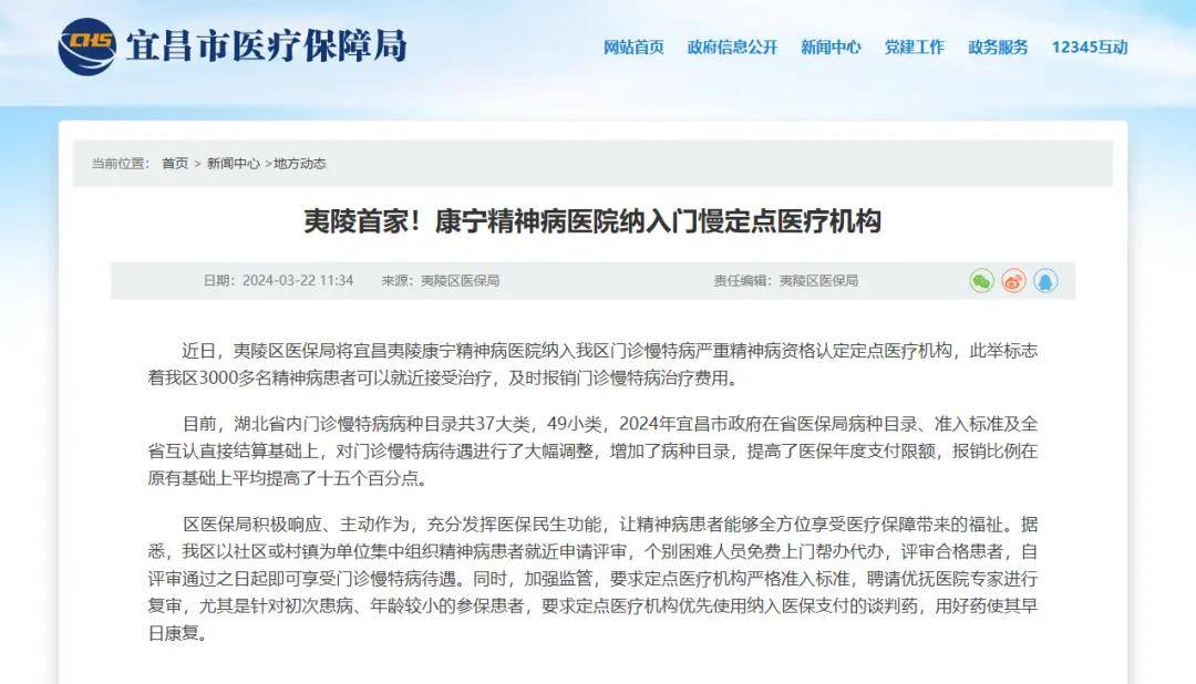 据夷陵区医保局消息,2024年,宜昌康宁精神病医院被纳入门慢定点医疗机构,成为该区首家门诊慢特病严重精神病资格认定定点医疗机构。