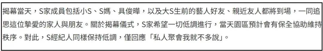 大S的一双儿女全程没有出现在碑文上,虽然两个孩子都不是成年人,不出现在现场很正常。但身为和孩子们相处两年的继父具俊晔也并没有给他们留下位置。