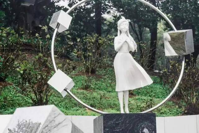 雕像四周围绕的九个立方体组成宇宙的轨道,“九”在汉语中谐音具,也是大S珍爱的数字。