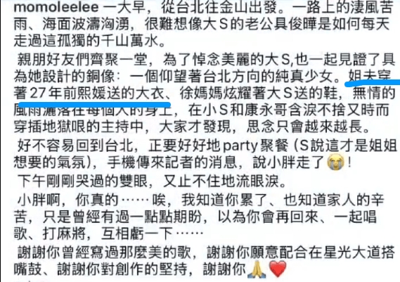 对此,大S的家人是保持着感谢的心情,小S特地在讲话中感谢了姐夫,称一想到姐姐最后三年和姐夫在一起很幸福,就很安心。