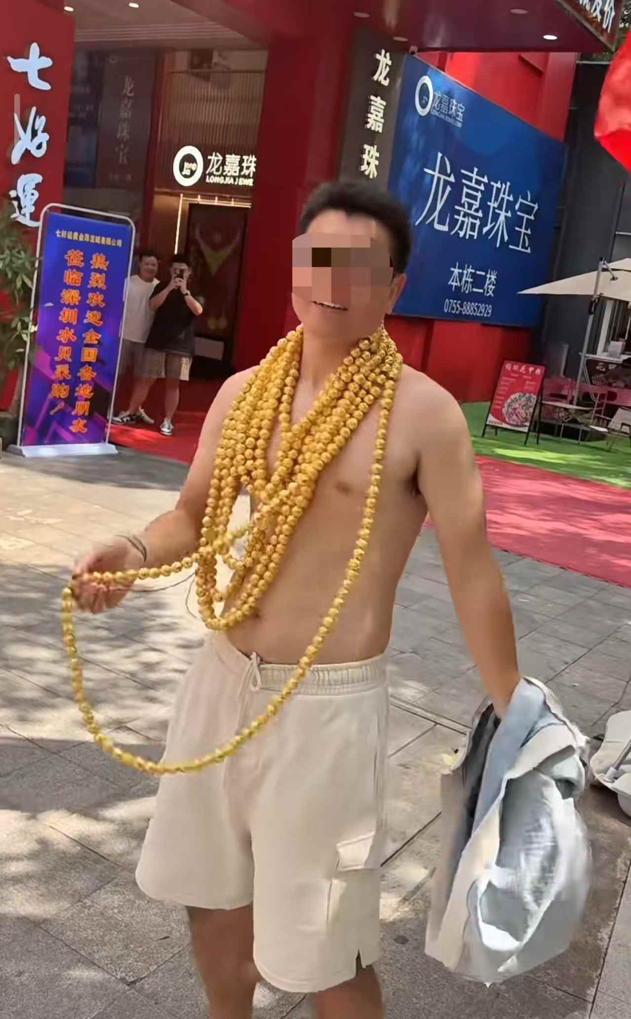 上图这位赤裸上身、带着十几根大金链的土豪,名叫张志腾,是深圳水贝黄金市场“杰我睿珠宝有限公司”的创始人。
