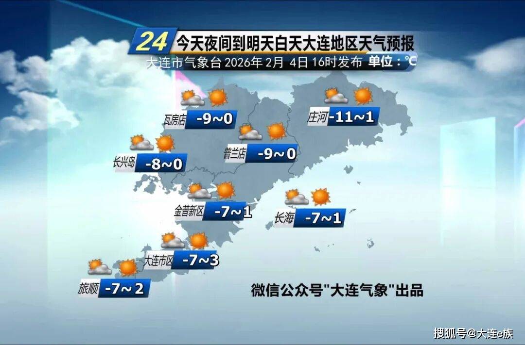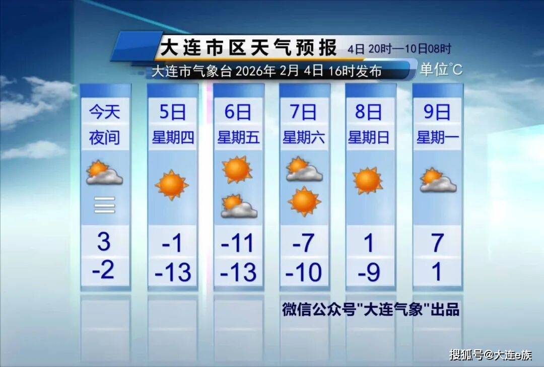 预计4日20时到6日8时,大连市中山区、西岗区、沙河口区、甘井子区、高新区气温将明显下降,降温幅度12℃左右,6日8时前后气温降至最低,最低温度降至-13℃左右。并伴有大风天气,5日8时至6日8时偏北风风力较大,大连近海、沿岸地区阵风最大可达8~10级,内陆阵风最大可达7~9级。请相关部门做好防寒潮工作。请广大市民注意防风保暖,对各类作物积极采取防冻措施。大连市气象台2026年02月04日16时40分发布