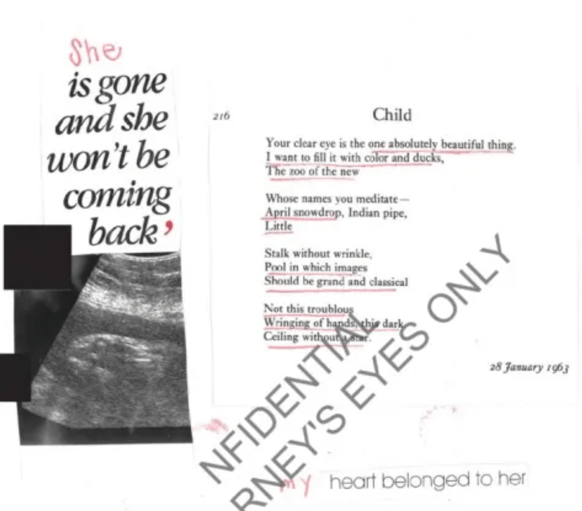 ▲这名受害者的日记中附有B超照片,写着“她走了也不会再回来了”,旁边还附上了美国女诗人西尔维娅·普拉斯创作于1963年的诗歌《孩子》