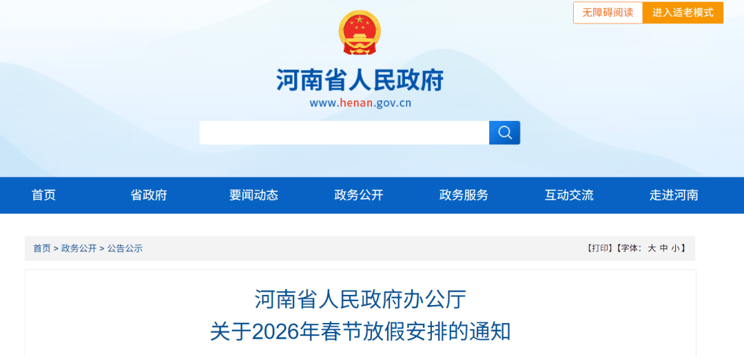根据《国务院办公厅关于2026年部分节假日安排的通知》(国办发明电〔2025〕7号)精神,为便于各地、各单位及早合理安排工作,现将2026年春节放假调休日期安排通知如下: