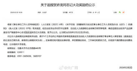 记者从新疆维吾尔自治区人社厅官网了解到,2月2日,自治区人社厅发布《关于追授贺娇龙同志记大功奖励的公示》。 公示称,据有关规定,经自治区农业农村厅评议推荐,自治区人力资源和社会保障厅研究等程序,确定追授自治区农产品品牌建设与产销服务中心主任贺娇龙同志记大功奖励,现予以公示。公示期为2026年2月2日至2月6日。(央广网记者 郭璁悦)