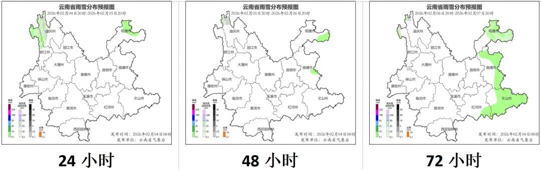 2月6日20时到2月7日20时:迪庆州北部、怒江州北部、昭通市北部的高海拔地区阴有小雪或雨夹雪,昭通市南部、曲靖市、文山州、红河州东南部多云转阴有分散小雨,其他地区晴间多云。