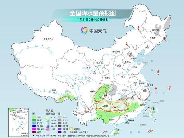 今天,南方雨雪继续减少、减弱,但湖南、贵州等地部分地区仍有冻雨,需注意防范。明后天,中东部大部将进入雨雪间歇期。随着寒潮和雨雪影响结束,后天起长江以南地区气温将陆续转为偏高,但北方多地气温仍然低迷,需注意保暖。