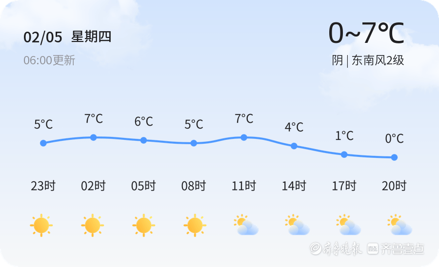 今天是2月5日,星期四,农历十二月十八。济南市迎来阴天,气温在0℃至7℃之间,当前温度为4.8℃,东南风2级,空气湿度为61%,PM2.5指数为147。各区天气情况基本一致,整体阴沉,风力较小,体感较冷。