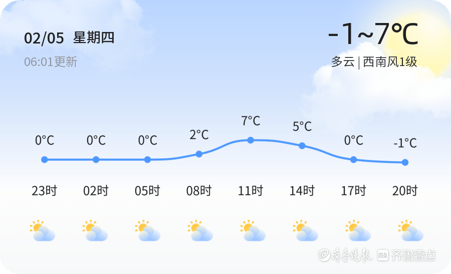 今天是2026年2月5日,星期四,农历十二月十八。淄博市今日天气多云,气温在-1℃至7℃之间,目前温度为-0.8℃,西南风1级,空气湿度89%,PM2.5指数为176,空气质量属于中度污染。建议市民出行时佩戴口罩,减少长时间户外活动。