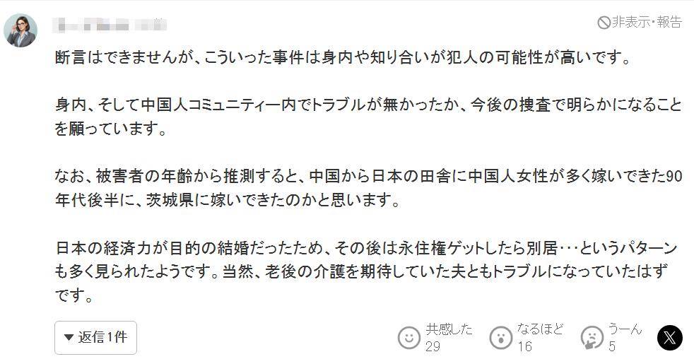 希望在后续的调查中能够查明,他的亲属之间以及华人社区内部是否存在纠纷。另外,从受害者的年龄推测,我认为她可能是在 90 年代后半期嫁来茨城县的,那个时期有很多中国女性从中国远嫁至日本农村。