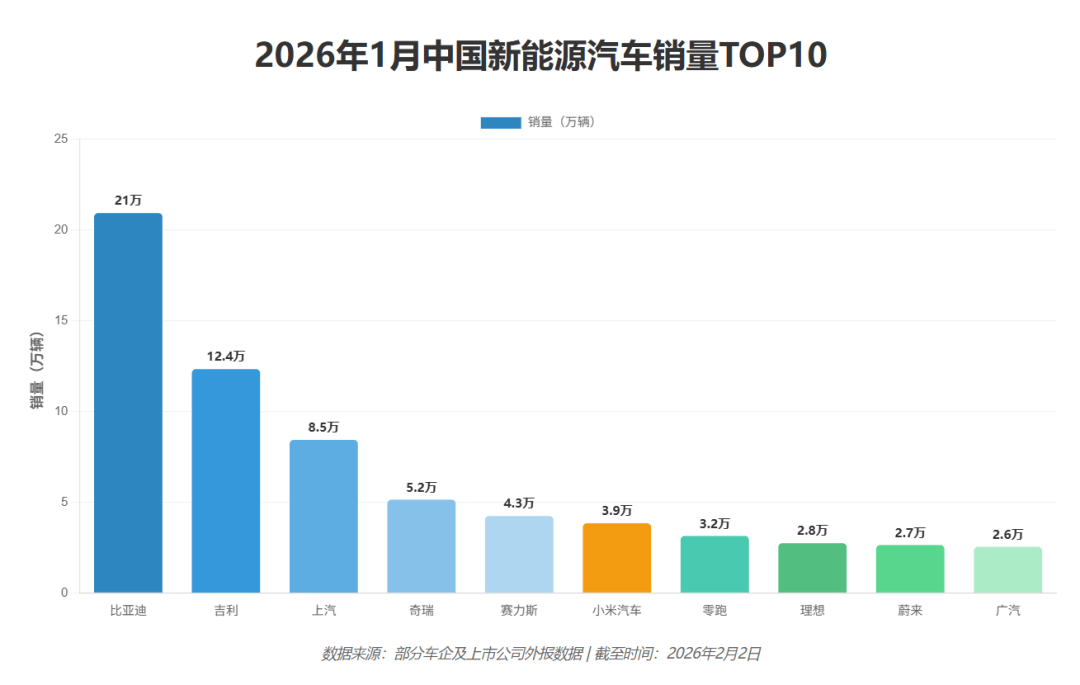 比亚迪以21万辆排在第一,稳坐新能源汽车销冠!