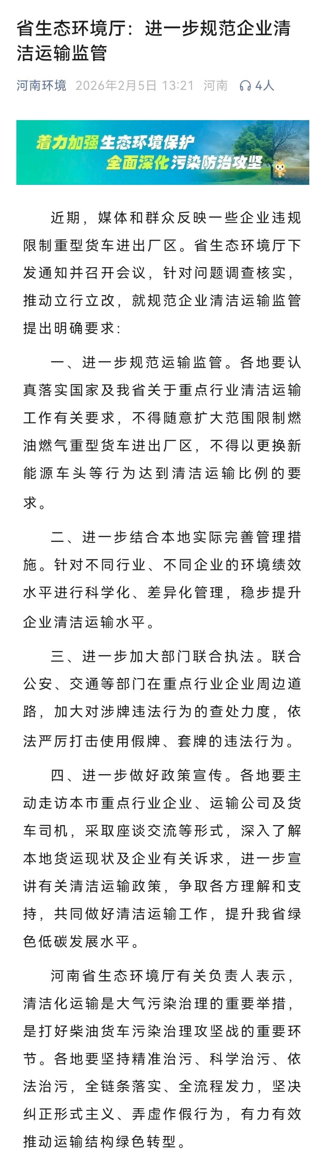 据“河南环境”微信公众号,近期,媒体和群众反映一些企业违规限制重型货车进出厂区。省生态环境厅下发通知并召开会议,针对问题调查核实,推动立行立改,就规范企业清洁运输监管提出明确要求: