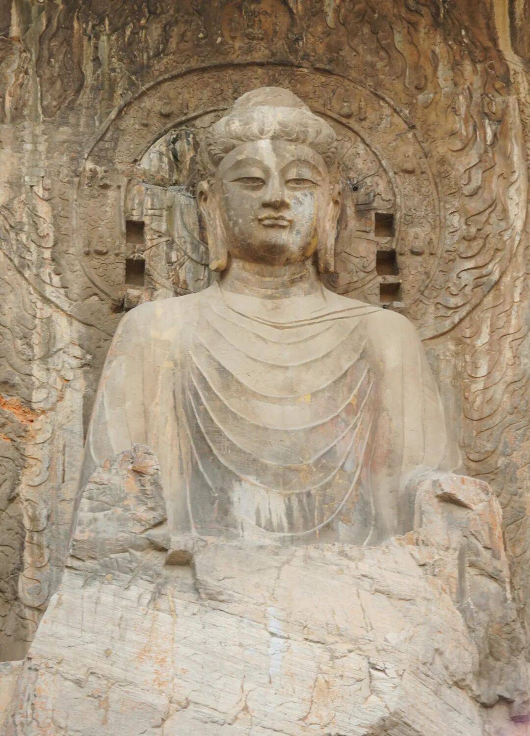 ▲位于龙门西山南部山腰奉先寺的卢舍那大佛,是龙门石窟中艺术水平最高、规模最大的一座造像,据传是按照武则天的形象塑造。