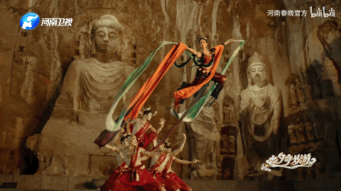 ▲河南卫视《龙门金刚》舞蹈节目,在洛阳龙门石窟之内实景拍摄。面相威严的“金刚护法” 与“伎乐天”形成了刚柔并济的呼应。雕刻着庄严佛像的龙门石窟穿越千年,在不动声色之中彰显着自身深厚的文化魅力。