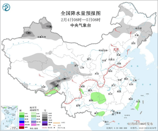 2月4日08时至5日08时,内蒙古东北部、东北地区中东部、新疆北疆大部和南疆盆地东南部、西藏南部和东部、青海中南部、甘肃南部等地部分地区有小雪或雨夹雪,其中,新疆北疆东部和伊犁河谷、西藏东部等地部分地区有中到大雪,局地暴雪(10~15毫米)。四川盆地西南部、贵州东部、湖南西部、广西东南部、广东西南部、台湾岛大部等地部分地区有小雨。内蒙古东南部和中部、河北北部、西藏北部、川西高原北部等地部分地区有4~5级风,阵风6~7级,南海东北部将有5~7级风、阵风8级。