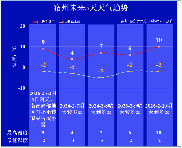 预计6日我市阴天,南部部分地区有小雨转雨夹雪或雪,其余时段以多云到晴天气为主。今天夜间至明天受冷空气影响,全市平均气温将下降8~10°C;同时,东北风逐渐增强至4级,阵风7~8级。过程最低气温预计出现在7日和8日早晨,最低气温-6~-4°C。