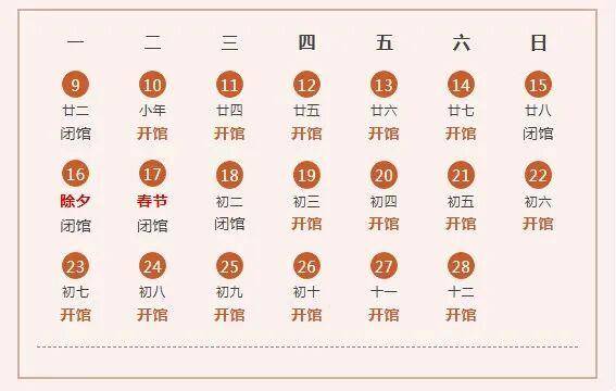 2月14日(腊月二十七)、2月20日—2月27日(正月初四至十一)正常开馆。