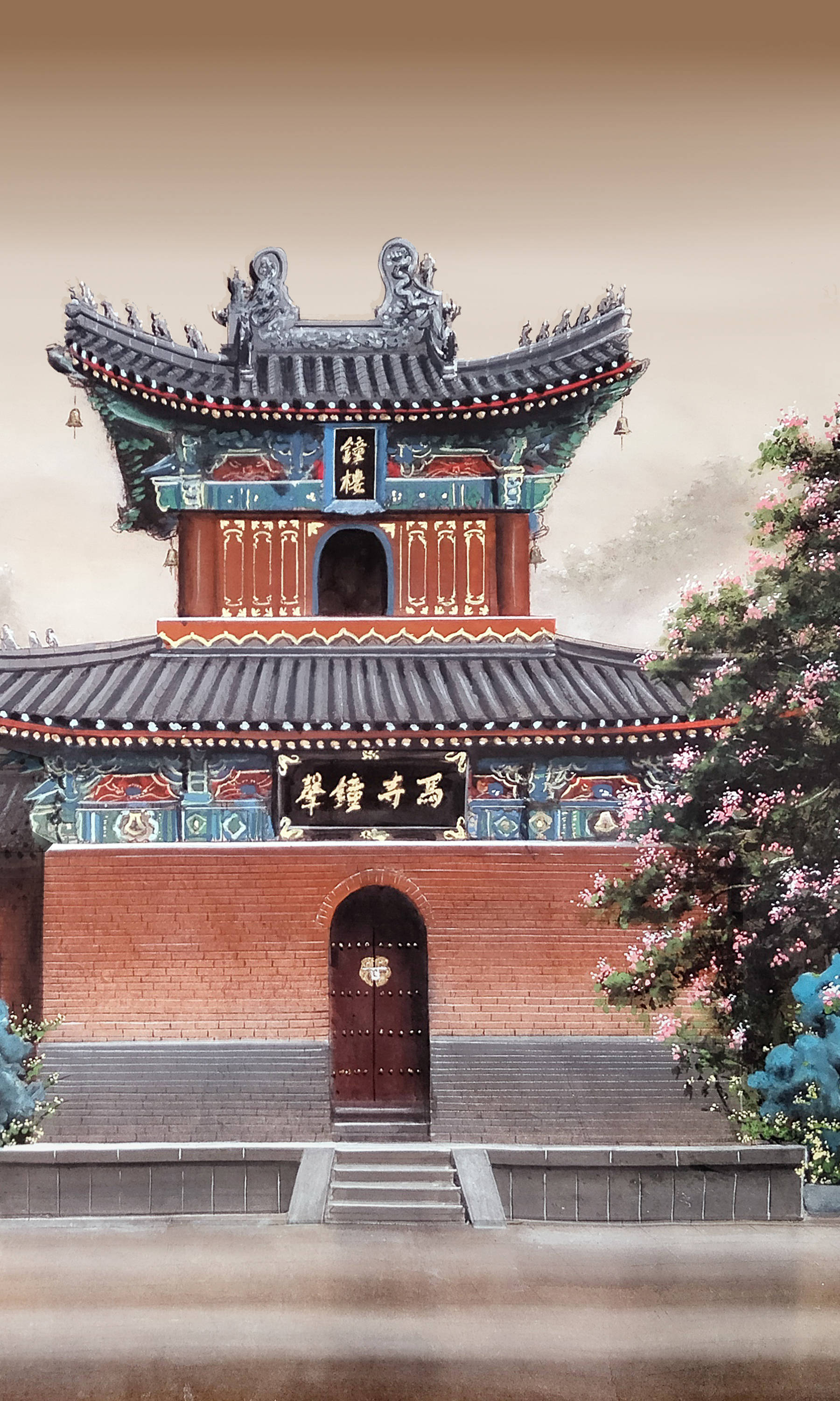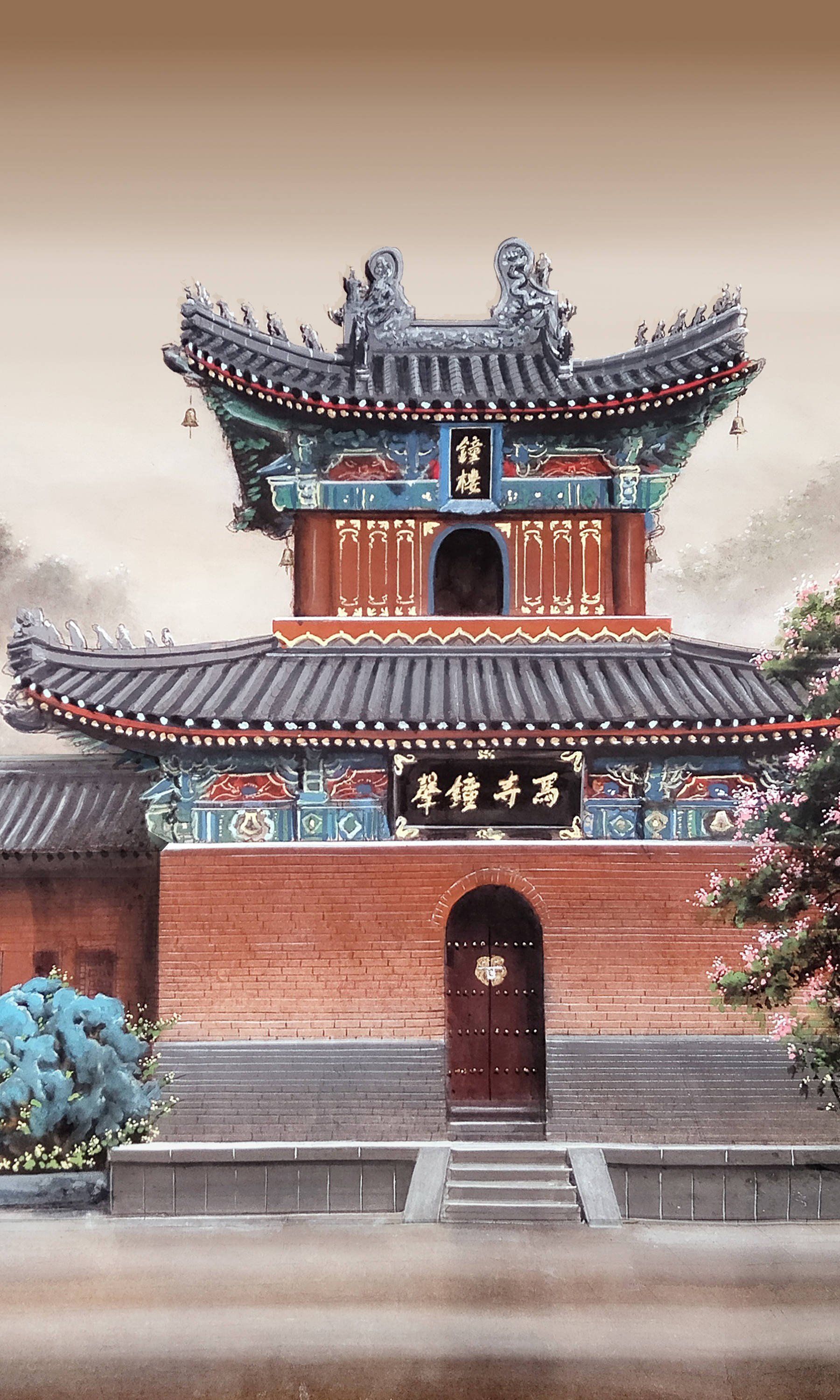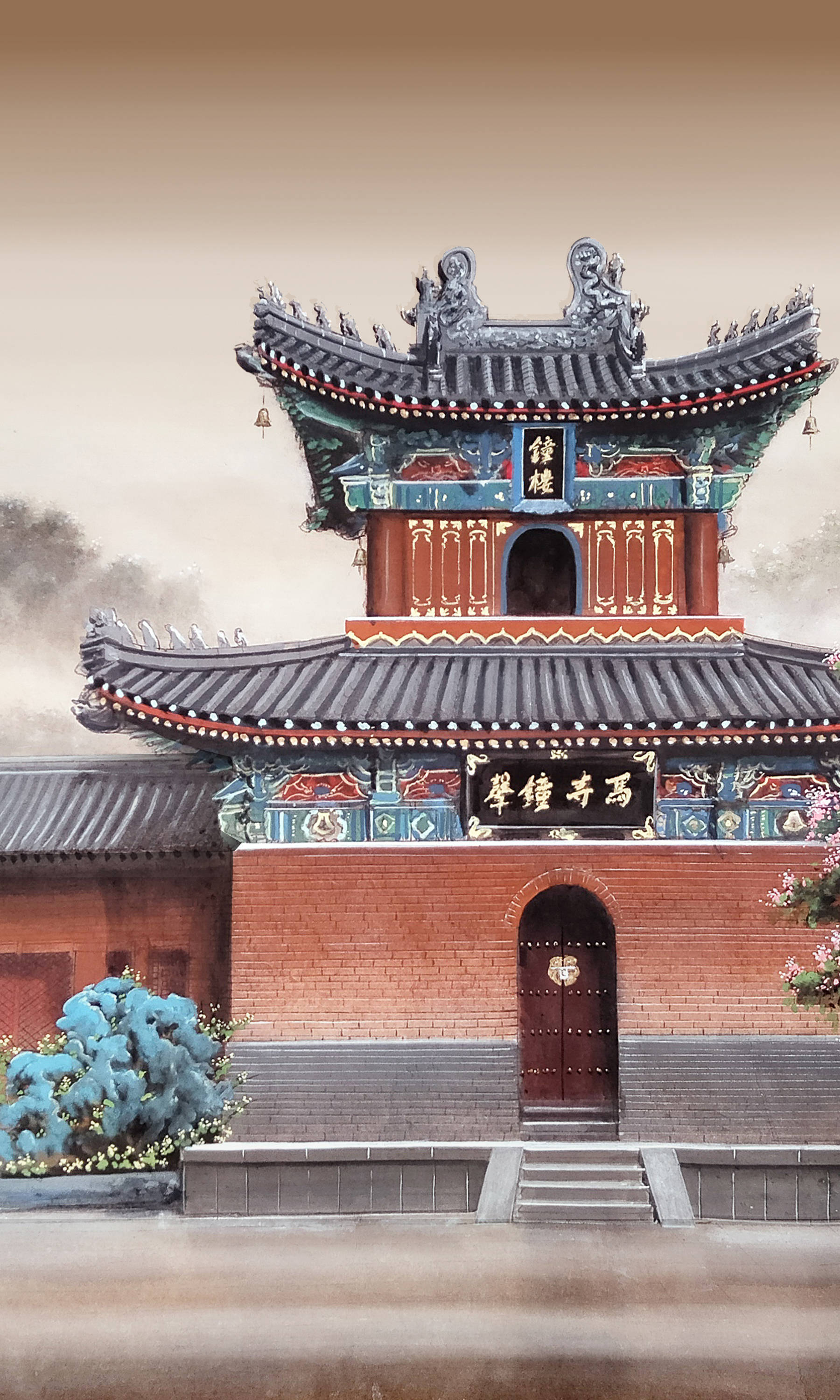 界画寒江---工笔界画《河南.洛阳白马寺.马寺钟声》局部。