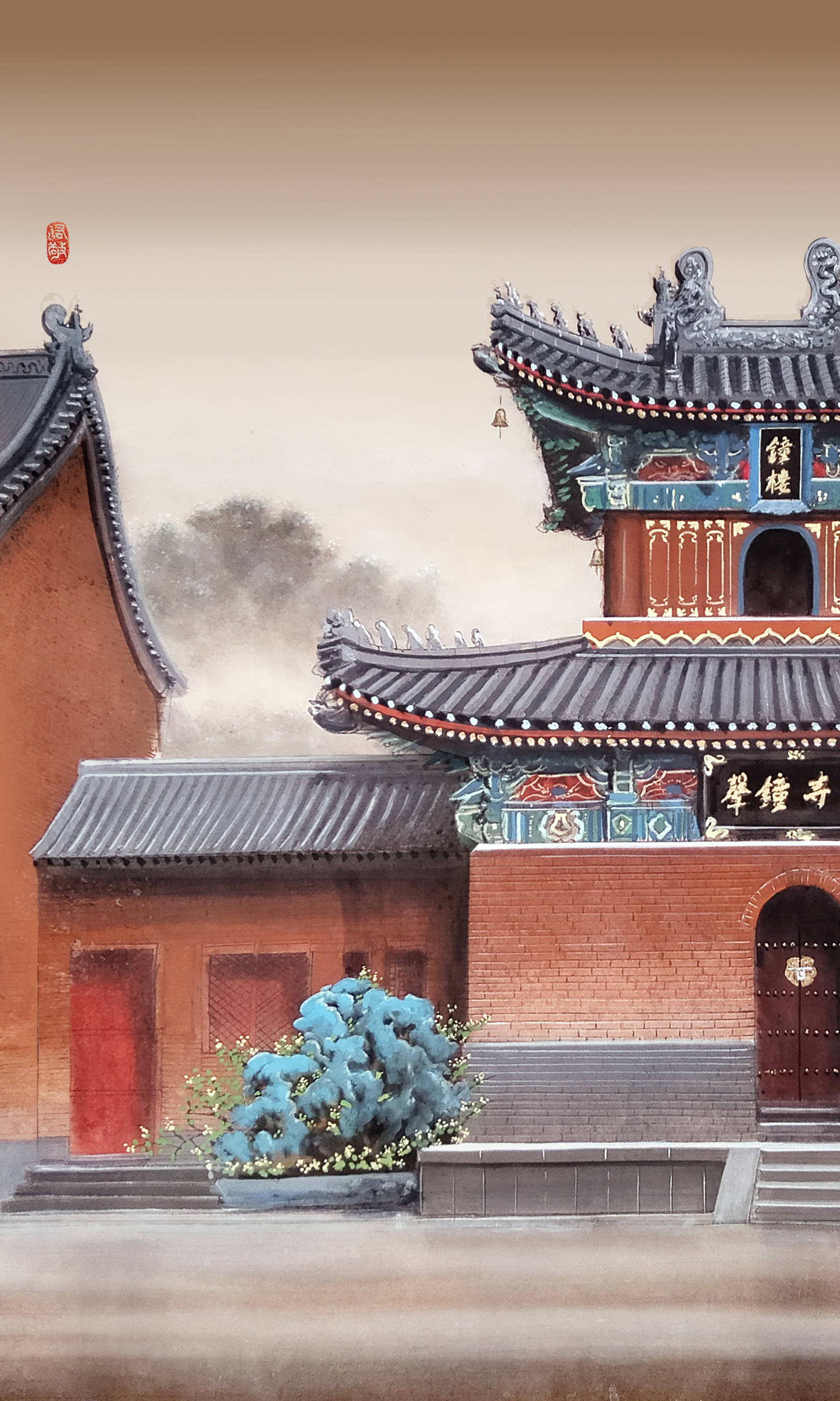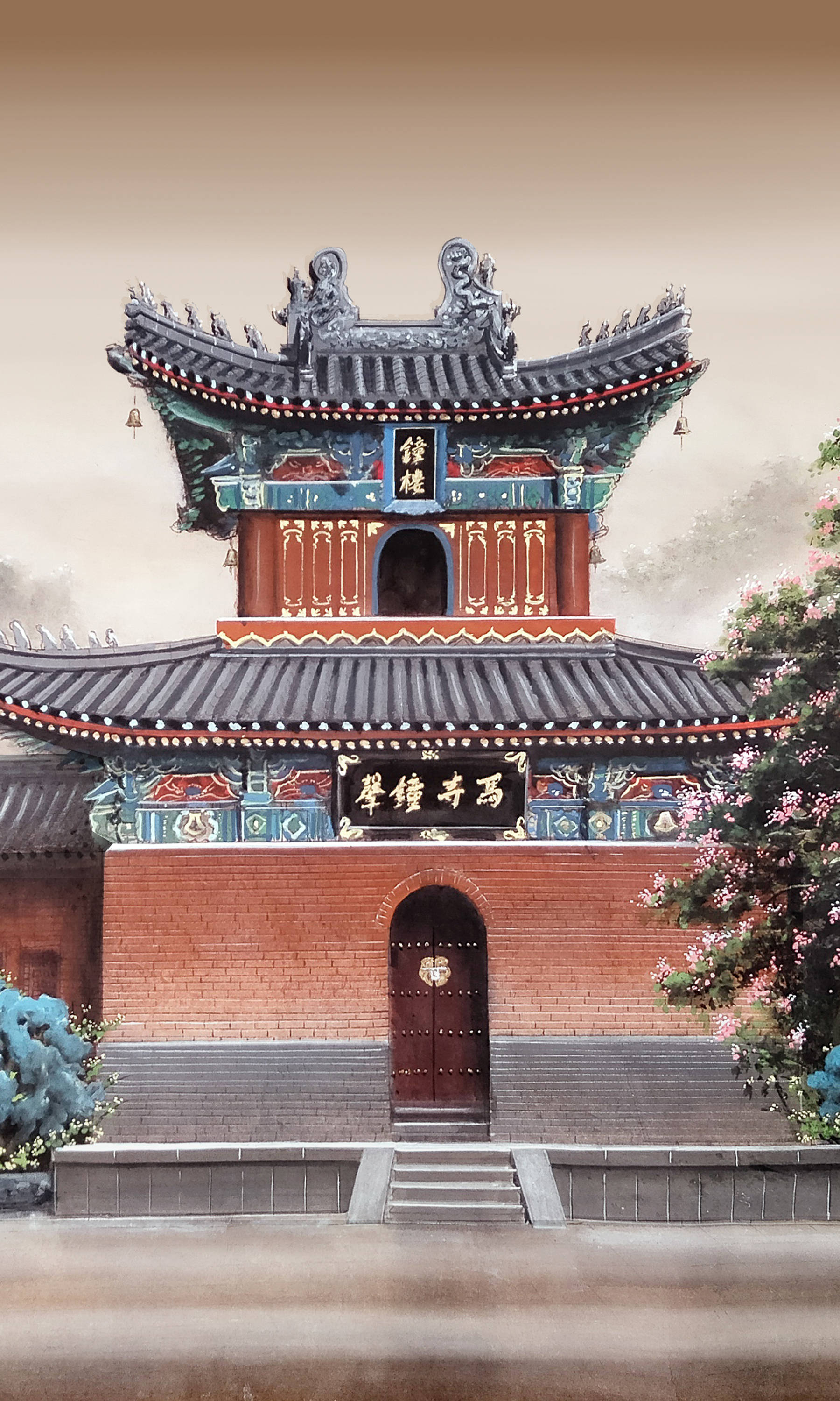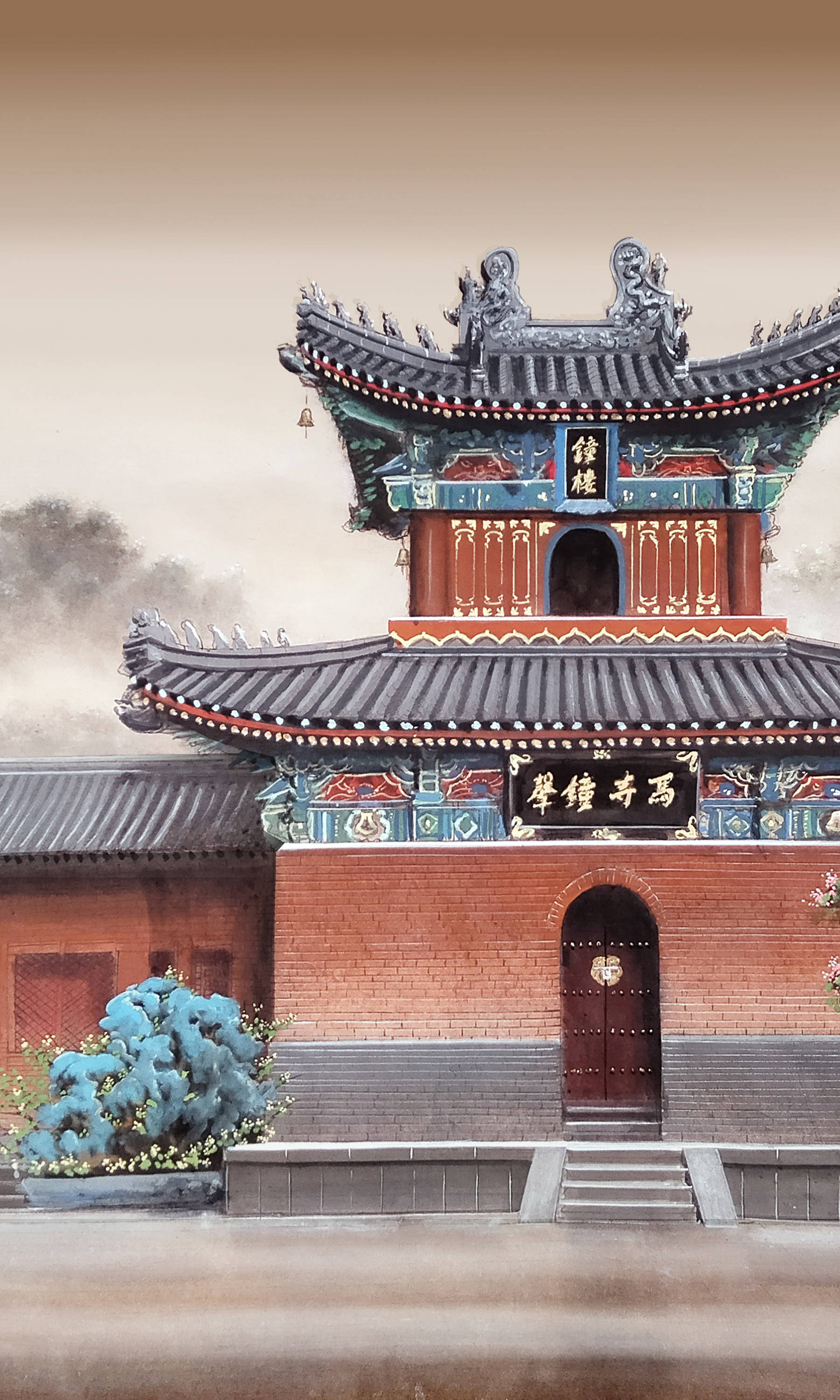界画寒江---工笔界画《河南.洛阳白马寺.马寺钟声》局部。