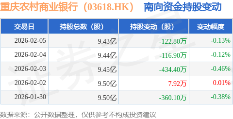 证券之星消息,2月5日南向资金减持122.8万股重庆农村商业银行(03618.HK)。近5个交易日中,获南向资金减持的有4天,累计净减持1026.28万股。近20个交易日中,获南向资金减持的有16天,累计净减持3344.82万股。截至目前,南向资金持有重庆农村商业银行(03618.HK)9.43亿股,占公司已发行普通股的37.51%。