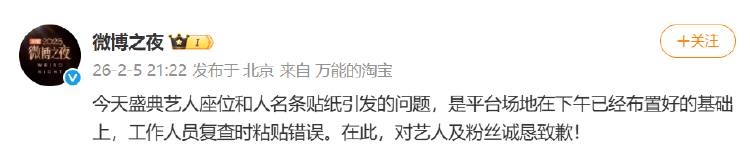 微博之夜发文道歉:今天盛典艺人座位和人名条贴纸引发的问题,是平台场地在下午已经布置好的基础上,工作人员复查时粘贴错误。在此,对艺人及粉丝诚恳致歉!