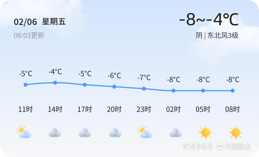 今日潍坊市迎来持续低温天气,全市各区普遍出现阴天,气温在-8℃至-4℃之间波动,东北风3级,空气湿度为61%,PM2.5指数为54,空气质量良好。当前时间为2026年2月6日,星期五,农历十二月十九。