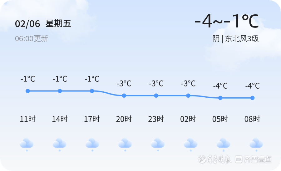 今天是2026年2月6日,农历十二月十九,星期五。济南市迎来阴天,气温在-4℃至-1℃之间,东北风3级,空气湿度为60%,PM2.5指数为52,属于良好。目前济南市部分地区有小雪,市民出行请注意防滑保暖。今日气温较低,建议市民减少外出,如需出行请提前做好防寒准备,注意交通安全。