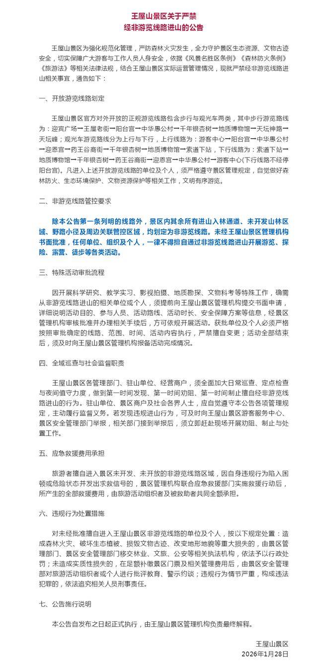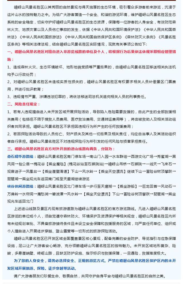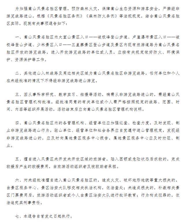 为强化规范化管理,严防森林火灾发生,全力守护景区生态资源、文物古迹安全,切实保障广大游客与工作人员人身安全,依据《中华人民共和国环境保护法》《中华人民共和国森林法》《中华人民共和国旅游法》《中华人民共和国自然保护区条例》《森林防灭火条例》《风景名胜区条例》等相关法律法规,河南多家景区结合实际运营管理情况,就严禁经非游览线路进山相关事宜发布公告。具体信息如下: