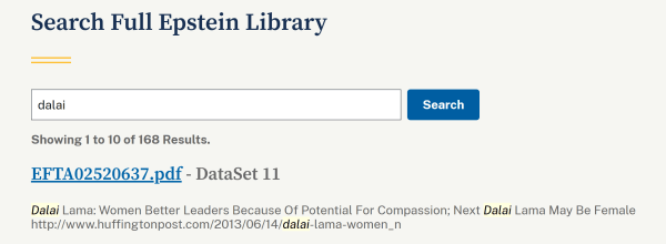 爱泼斯坦档案中,关键词“dalai”出现168次。美国司法部网站截图