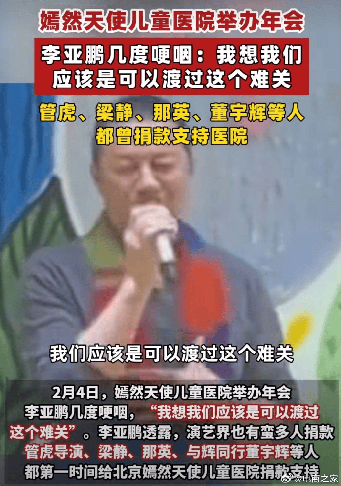 2月4日,嫣然天使儿童医院的年会上,李亚鹏说着说着就红了眼眶,哽咽着吐出一句“我想我们应该是可以度过这个难关”,短短几秒的视频却感动了全网。