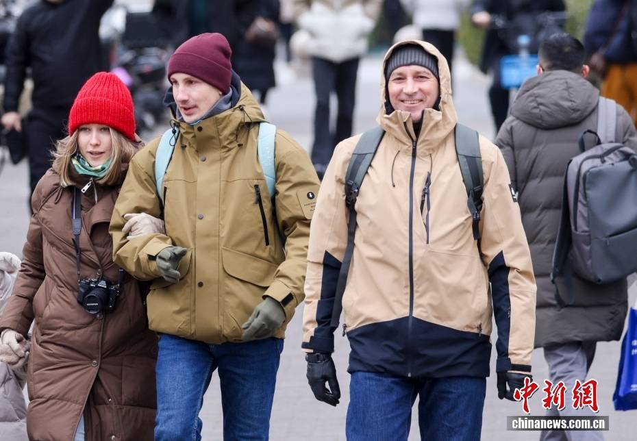 2月5日,外国游客在街头出行。当日,受新一轮寒潮天气影响,北京气温大幅下降。