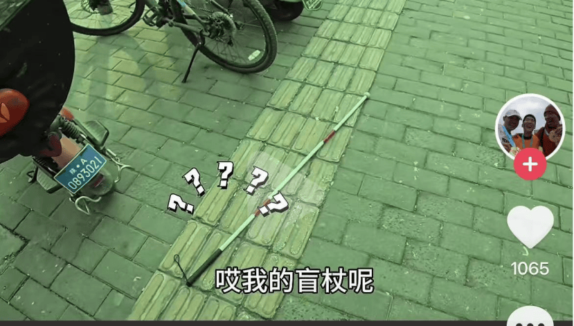 ▲来自社交媒体视障博主@谭走鱼尾纹视频作品:电动自行车停在盲道,导致该博主撞倒,后博主将车扶起,因为双手扶车,找不到丢在地上的盲杖